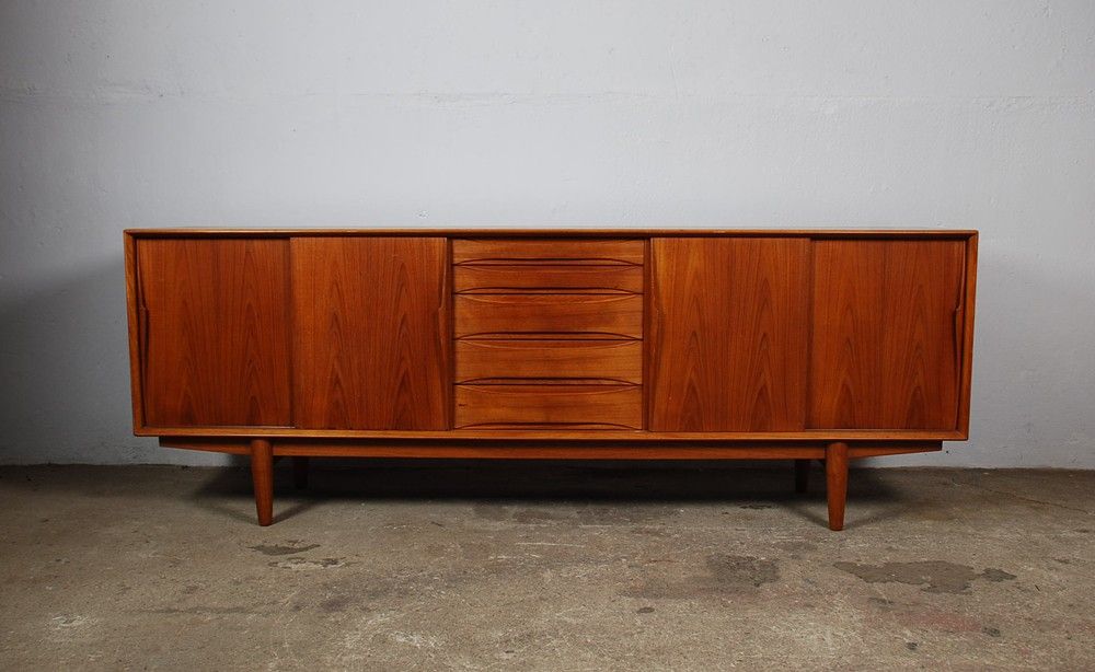 Sehr elegantes Teak Sideboard mit 4 Schiebetüren und 5 Schubkästen. Ein besonders schönes Detail sind die Griffe der Schiebetüren.