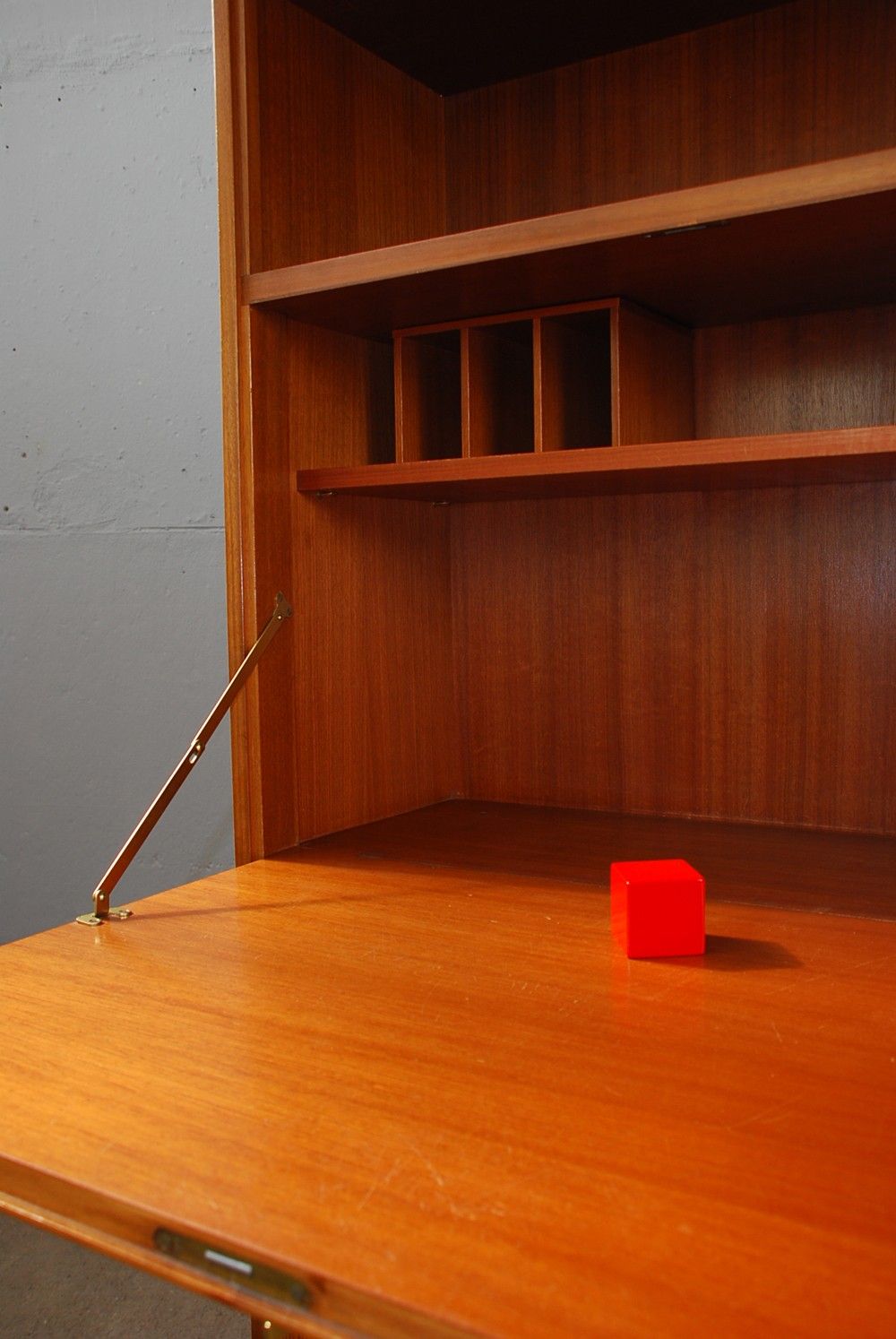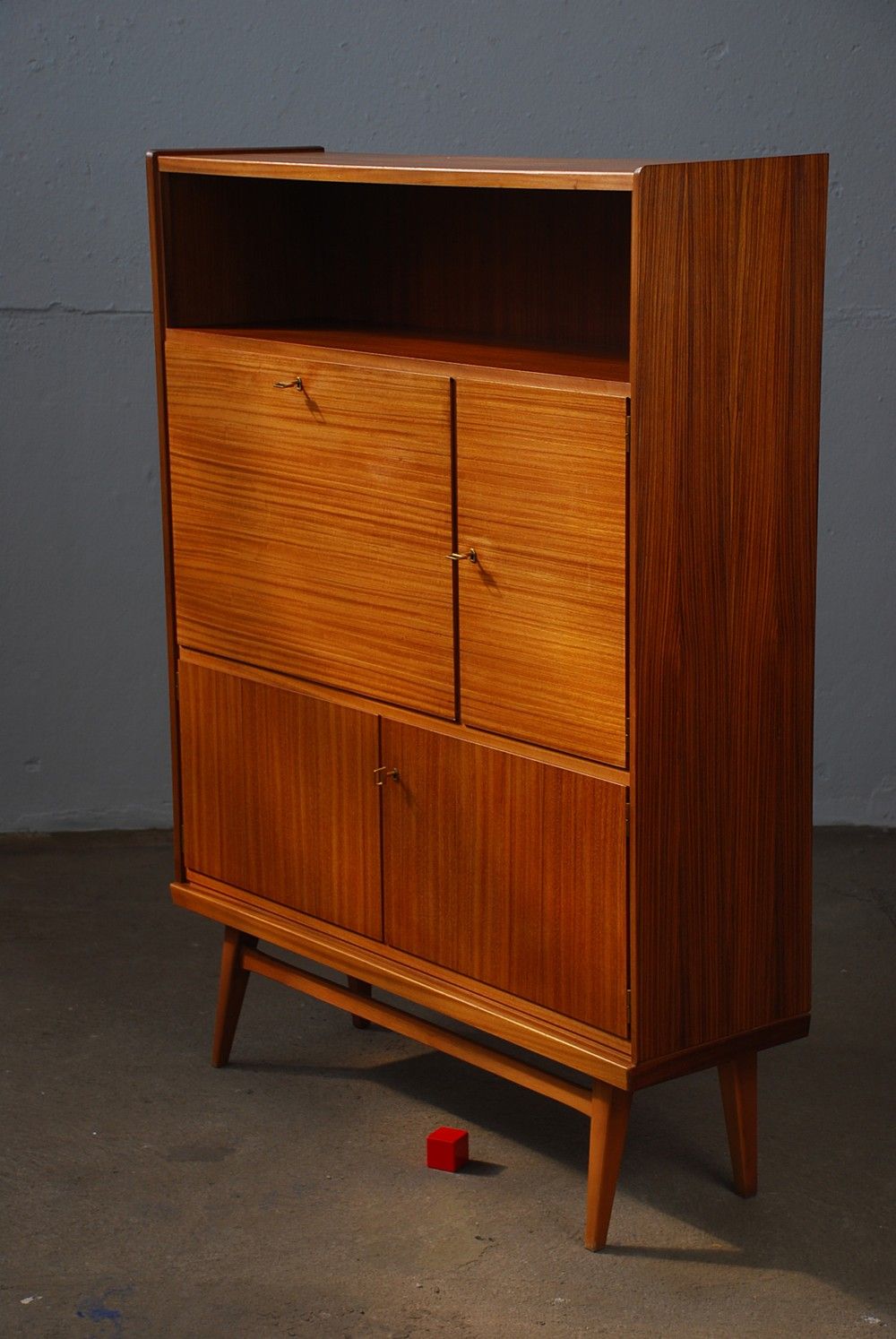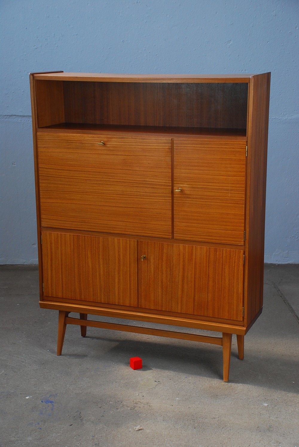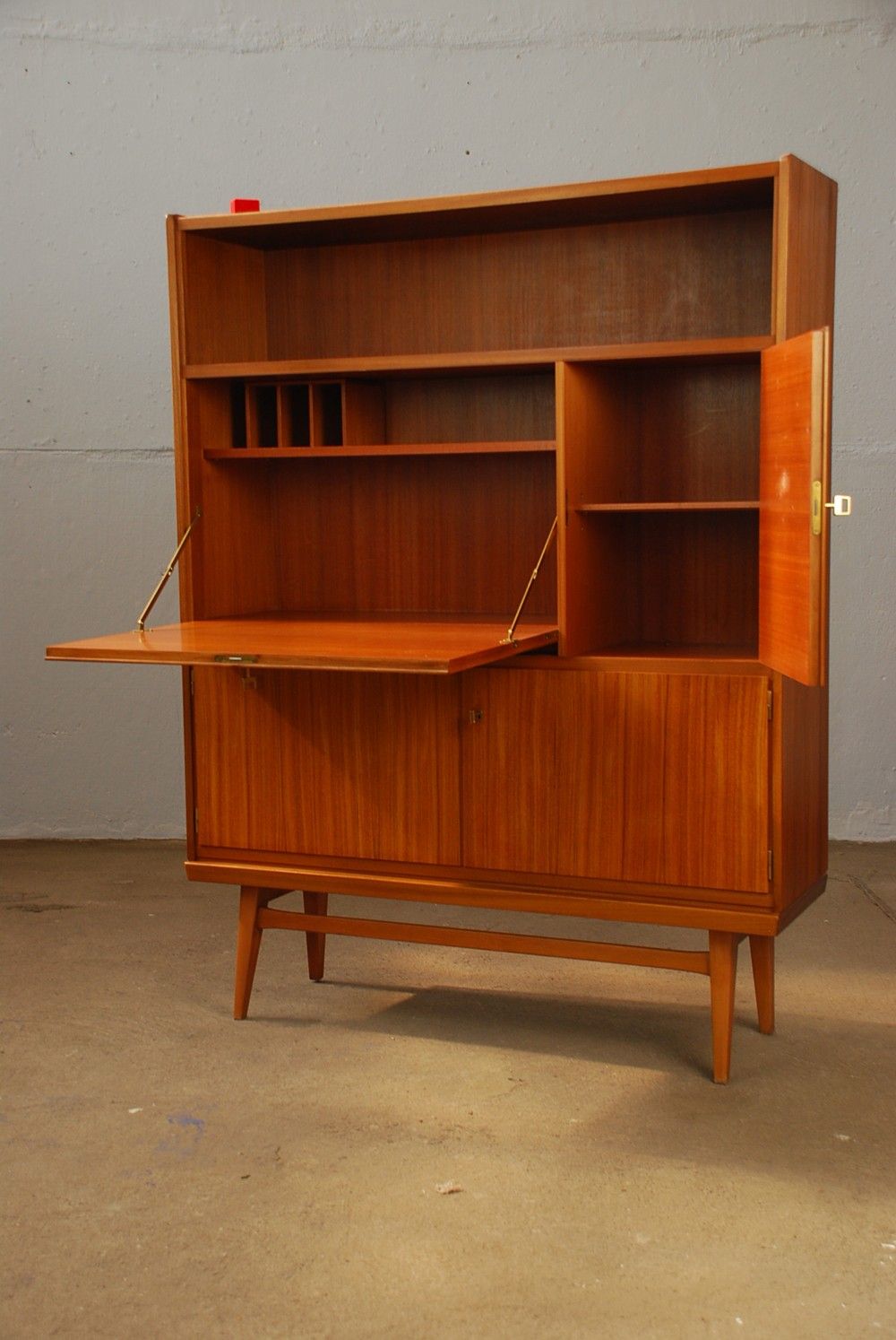 Seltenes und hochwertiges Highboard von Behr Möbel Wendlingen. Das Board verfügt über schöne Details wie: Messinggriffe, ein Sekretärfach und ein wunderschönes Furnierbild.