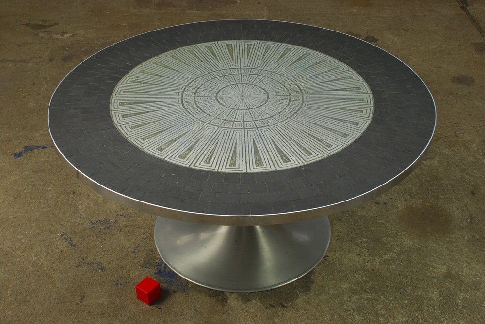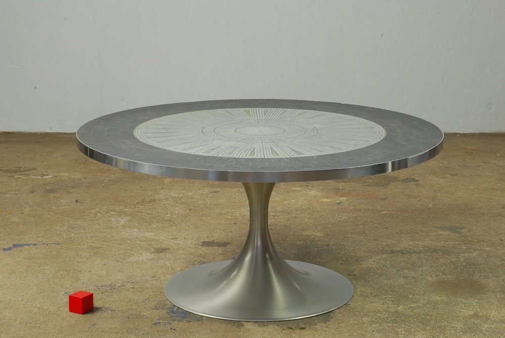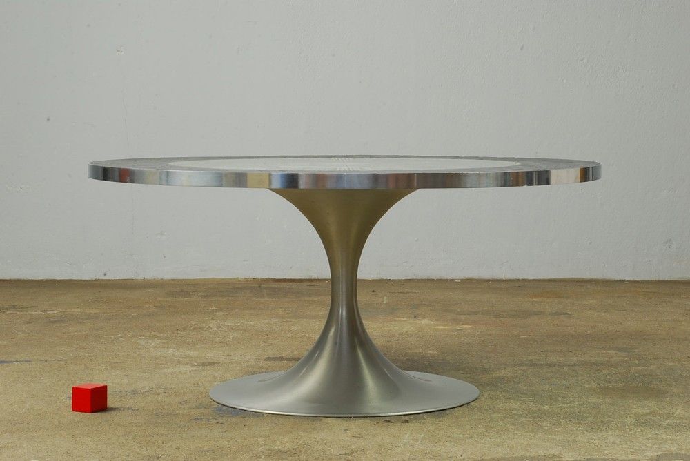 Seltener Couchtisch mit Tulpenfuß aus Aluminium, Deckplatte mit Schiefer und Aluminium belegt.