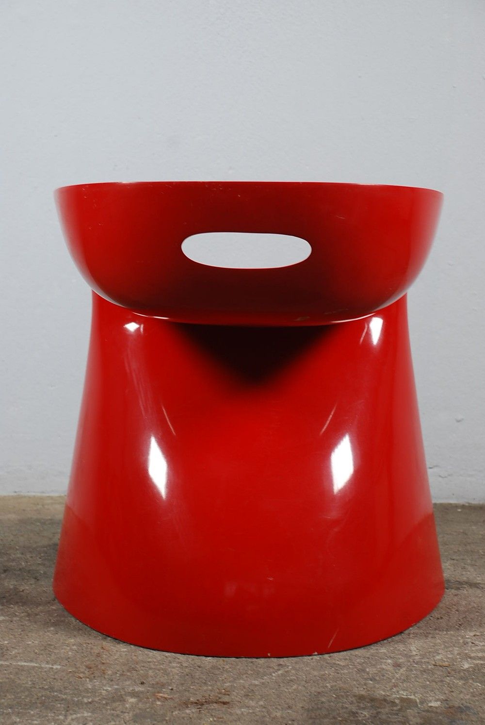 Seltener Hocker von Winfried Stäb aus Polyurethan. Besitzt ein Greifloch und leichte Rückenunterstützung. Lackiert in rot.