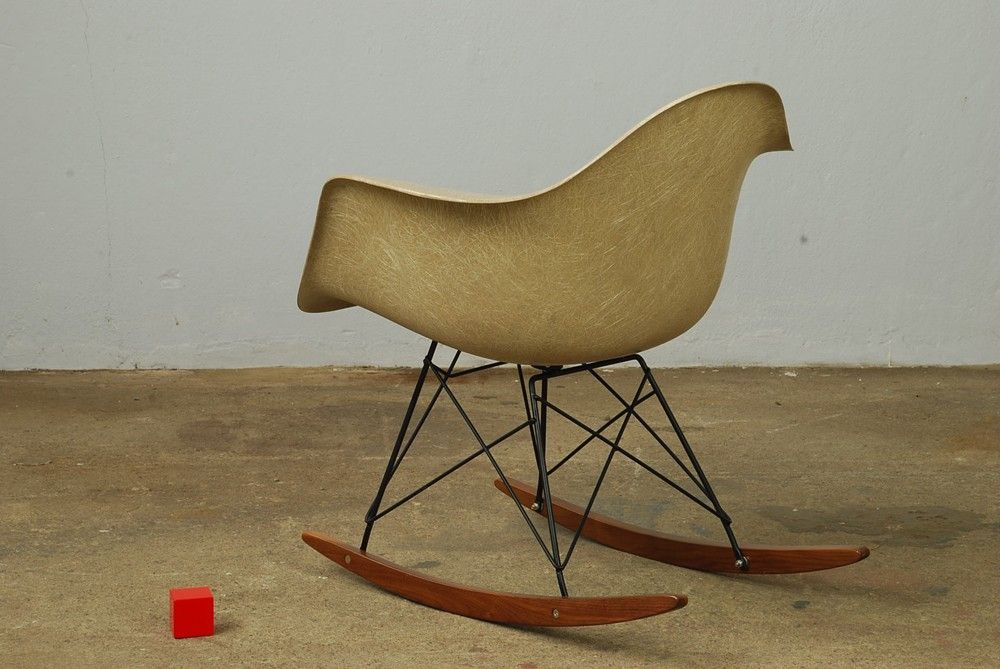 Very rare armchair on rocker base in greige color.The seatpad was furnished wit a hopsack in anthracite. The fibres are beautiful marked and the base is of recent date.